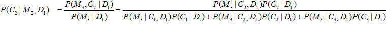 For the Monty Hall problem we have three important variables. The door you choose (Dn), the door Monty opens (Mn) and the door that actually has a car (Cn). So the probability that the car is behind door #2 (C2), given that you chose door #1 (D1) and Monty opened door #3 (M3) is: