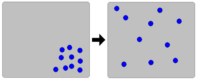 Another, even less rigorous definition of entropy is the amount of disorder of a system. In the boxes example above, the particles on the left are very ordered, while the particles on the right are disordered. The second law of theromdynamics, then, roughly states that a system will always move from the left box to the right - from order to disorder.