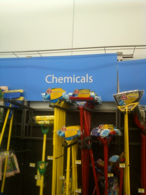 It's a bit of tightrope that we walk, though, and sometimes we over-correct. Let's face it, chemicals can be very bad for you. Sometimes, in the midst of our #chemophobia rage we seem to be forgetting that - or at least trying to ignore it. Most of the things that the public labels as "chemicals" probably are toxins. My guess is that Wal-Mart, in the picture above, meant to stock bleach, ammonia, and other cleaners under that sign. I wouldn't suggest drinking any of those. We say nothing when ammonia is called a chemical (because, well, it is a chemical). The word chemical, then, becomes associated with bleach, ammonia, and industrial strength solvents. That association makes it difficult to teach someone that aspartame is a chemical but you can drink a diet soda just fine. Chemical is already so well connected with toxin that it's not always an easy task.