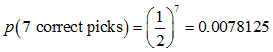 That is, there is a 0.78125% chance that Eli would pick the winner of the Super Bowl 7 times between the year 2008 and 2014. Or you could say that there is a 99.21875% chance that Eli would have gotten at least one of those years wrong: